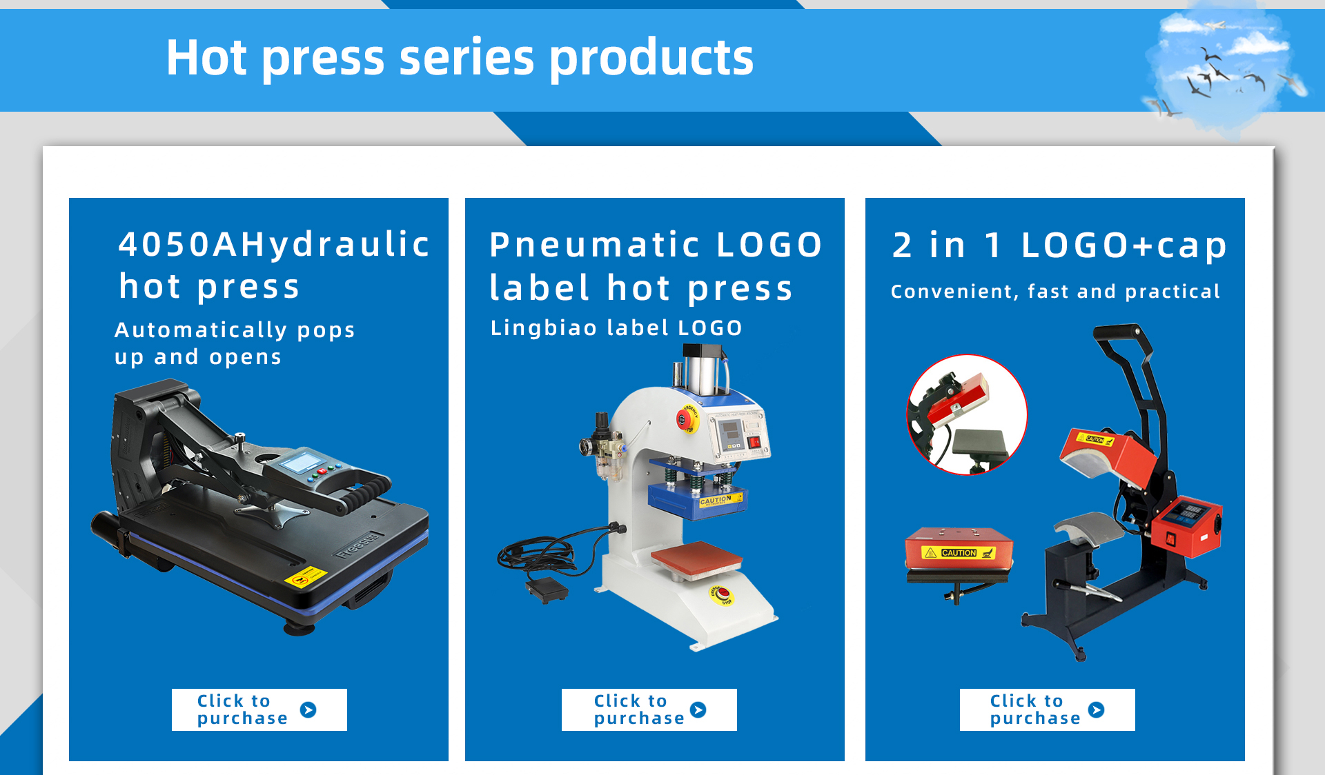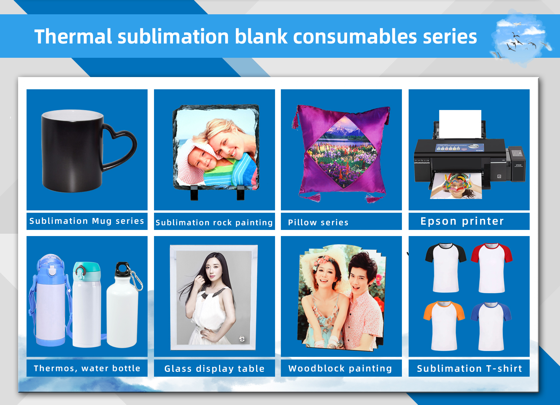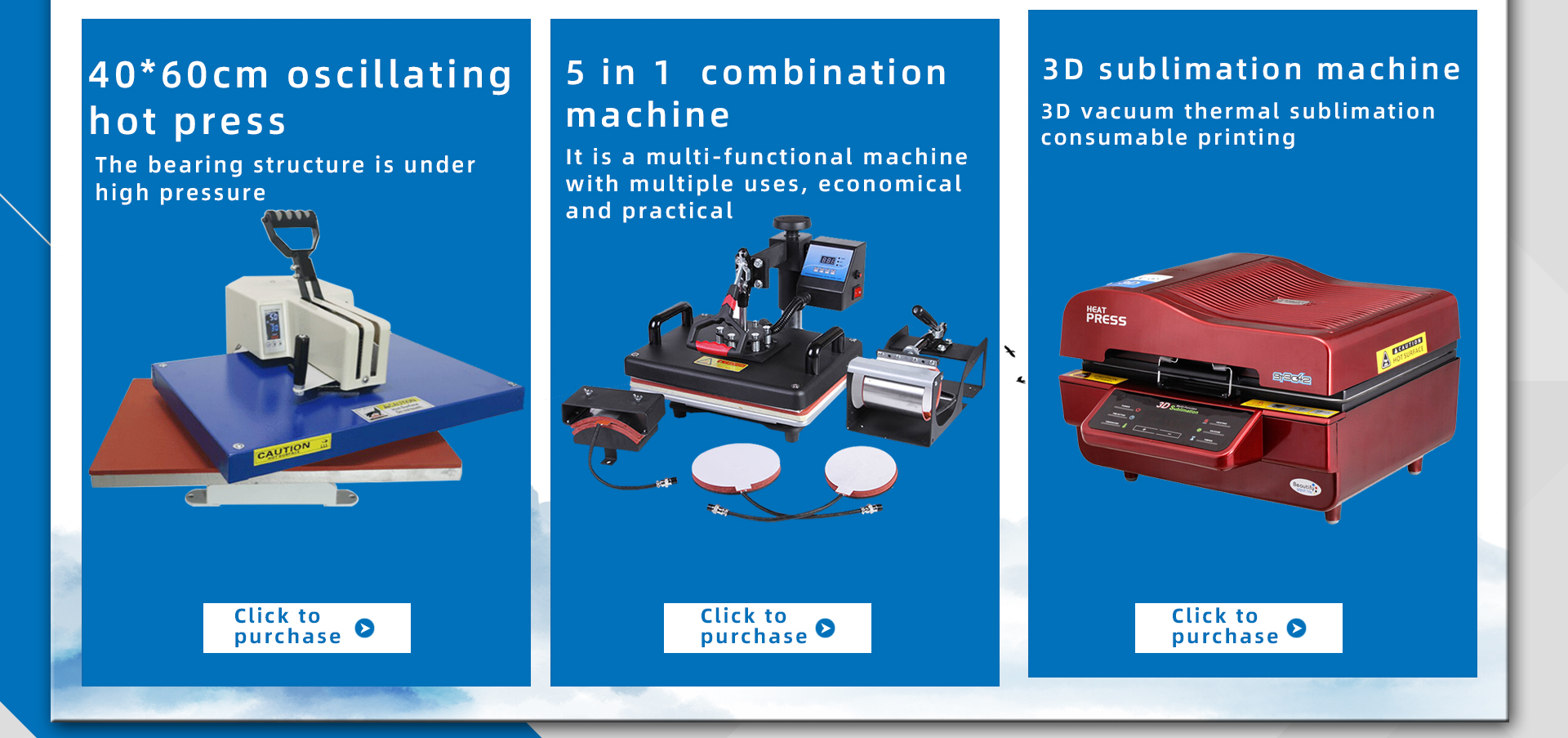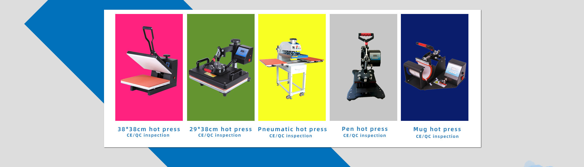 Productos principales:Prensa caliente, máquina de transferencia de calor, máquina tostadora de tazas, papel de sublimación térmica, consumibles de sublimación térmica